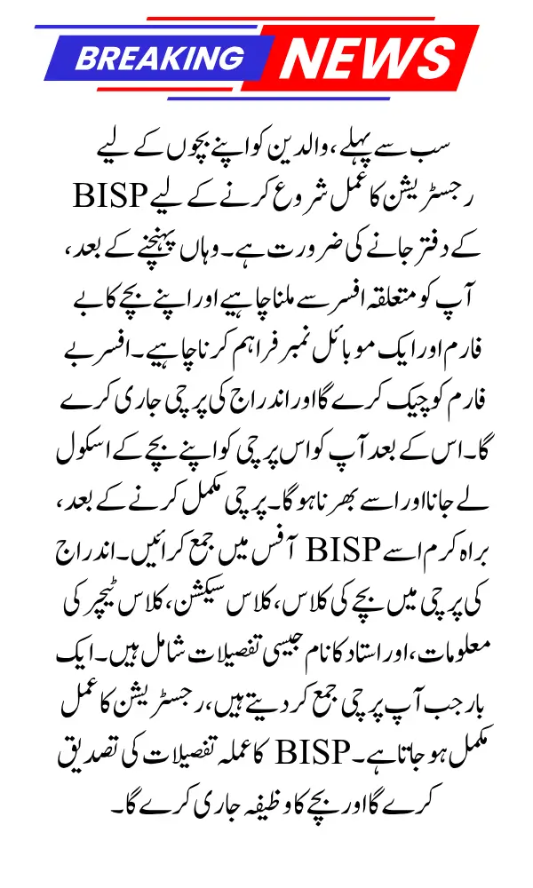 First, parents need to visit the BISP office to start the registration process for their children. Once there, you must meet the concerned officer and provide your child’s Bay form and a mobile number. The officer will check the Bay form and issue an enrollment slip. You will then need to take this slip to your child’s school and fill it out. After completing the slip, please submit it to the BISP office.